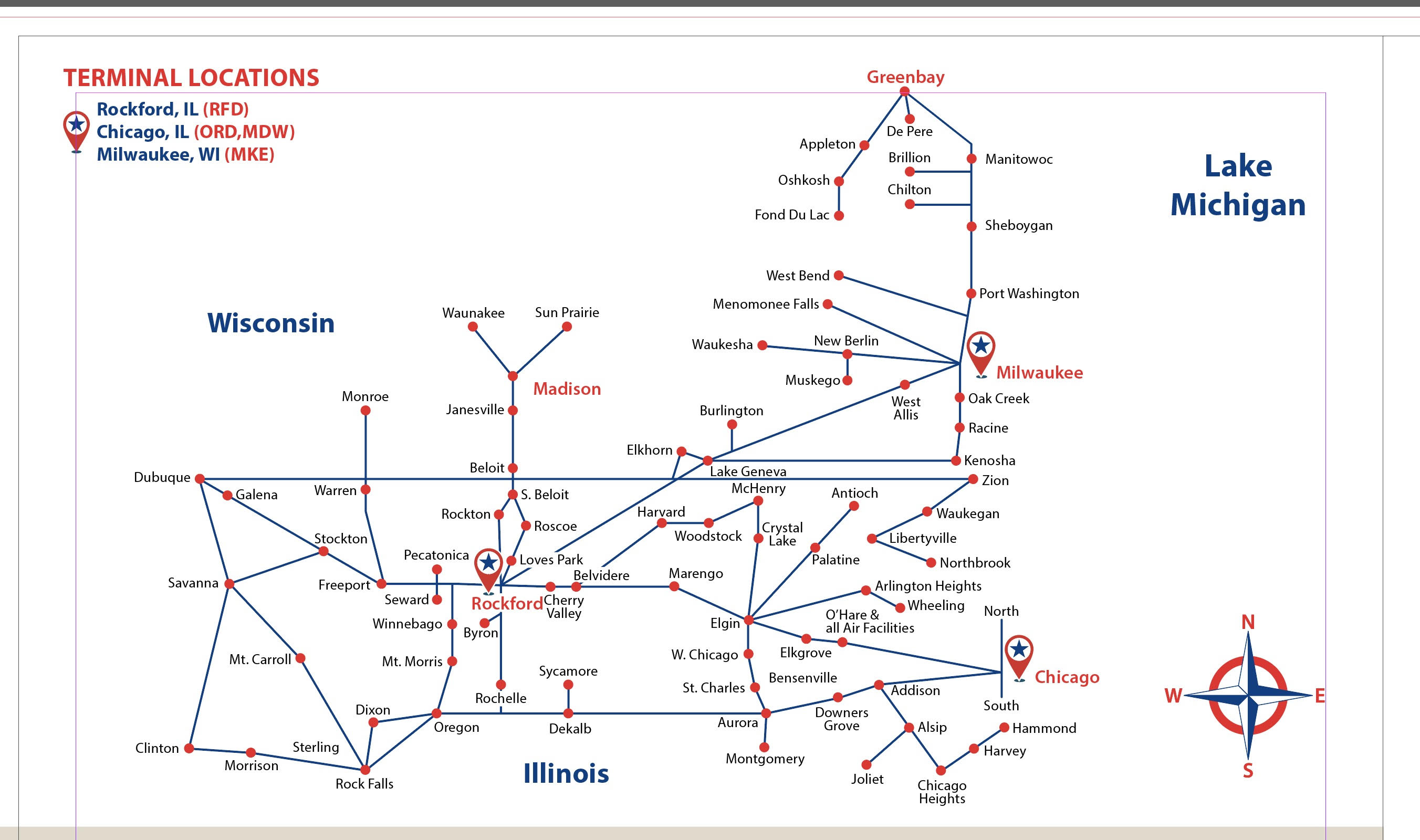 • Company terminals located in Rockford, IL (RFD), Bensenville, IL (ORD, MDW) and Cudahy, WI (MKE)